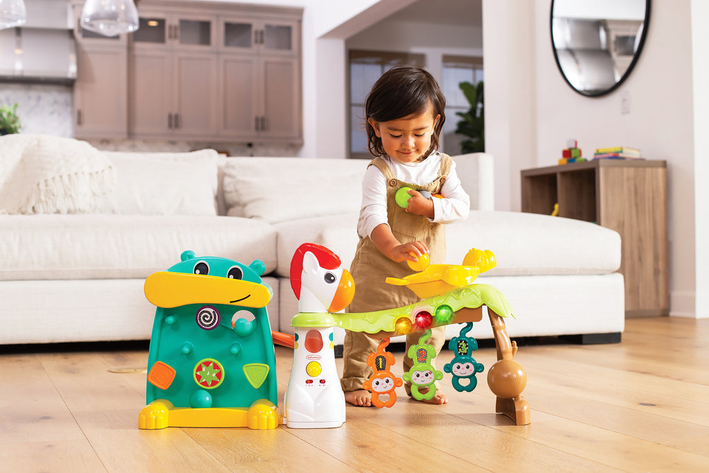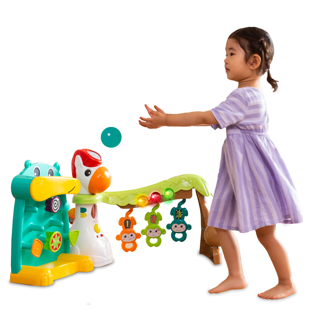 4 : Appuyez sur les leviers de l’hippo ou déposez les balles dans la bouche de l’hippo pour regarder les balles sauter et rebondir autour du plateau lumineux.