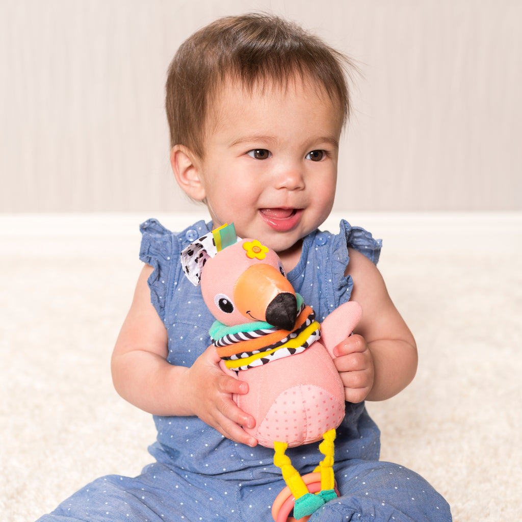 Peluche flamand rose musicale toute douce. Sa taille est idéale pour être câlinée. Elle accompagne bébé dans tous ses déplacements, en poussette, en voiture ou même à la maison pour la sieste… Il suffit de tirer sur les deux anneaux en plastique coloré pour écouter la jolie mélodie et voir le corps du flamand rose se recroqueviller au fur et à mesure de cette mélodie. Elle est facile à suspendre avec sa patte auto agrippante sur la partie supérieure de la tête.