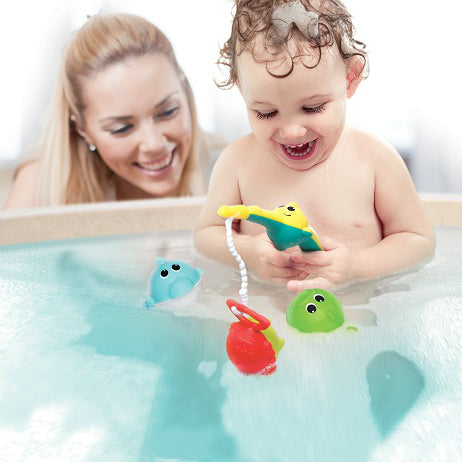 Petite canne à pêche avec 3 personnages de l'océan à attraper. Le poisson, le crabe et le dauphin ont des corps démontables et compatibles entre eux. Bébé peut créer ses propres animaux de l'océan. Tous sont des passoires, c'est encore plus amusant.