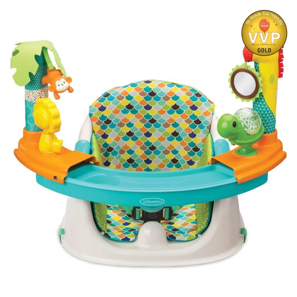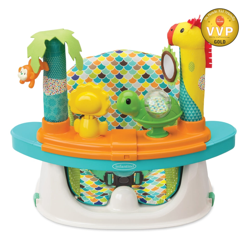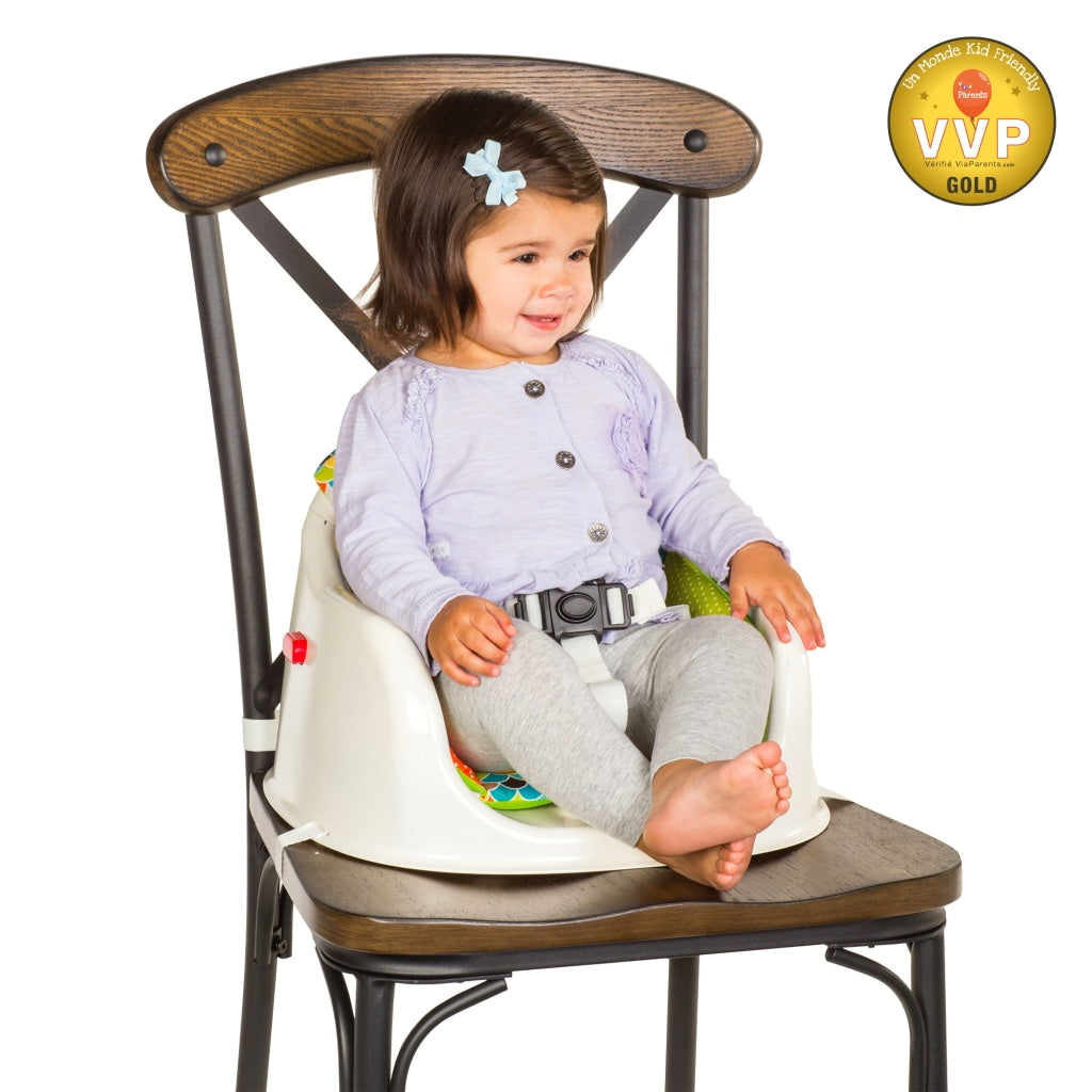 3 en 1, siège d’activités, rehausseur avec plateau pour le repas et rehausseur. La sécurité est maximale avec la ceinture 3 points et la double fixation par sangles pour utilisation sur une chaise d'adulte. L’assise en tissu rembourrée est confortable pour bébé, et amovible pour un entretien facile. Il est muni d'un plateau pour le repas (conforme à la norme alimentaire EU N° 10/2011) avec compartiment pour une tasse ou biberon. Ce plateau est détachable et peut être lavé séparément.
