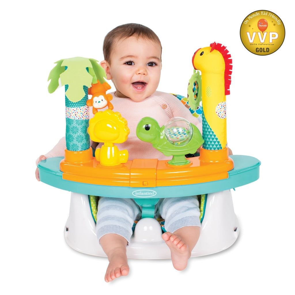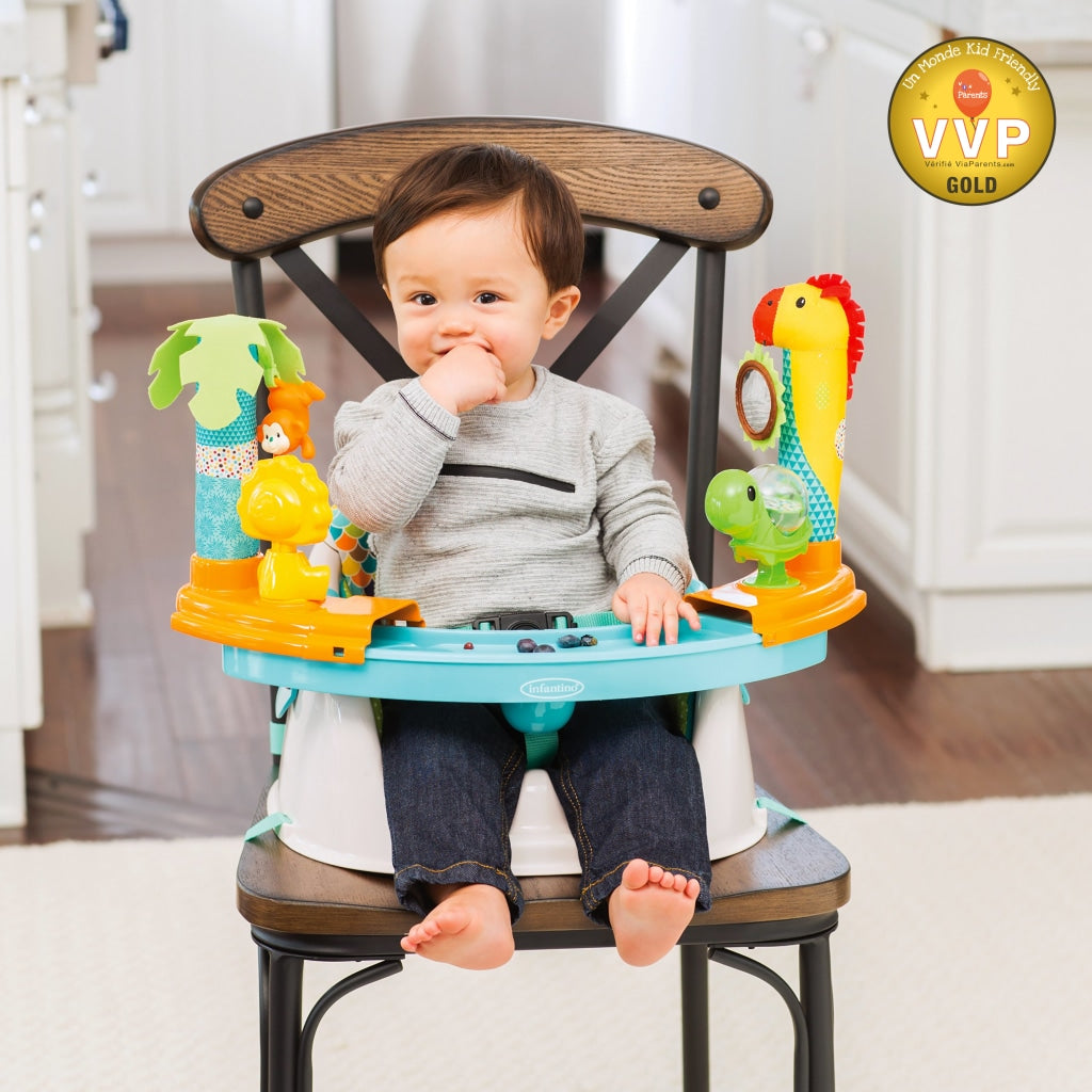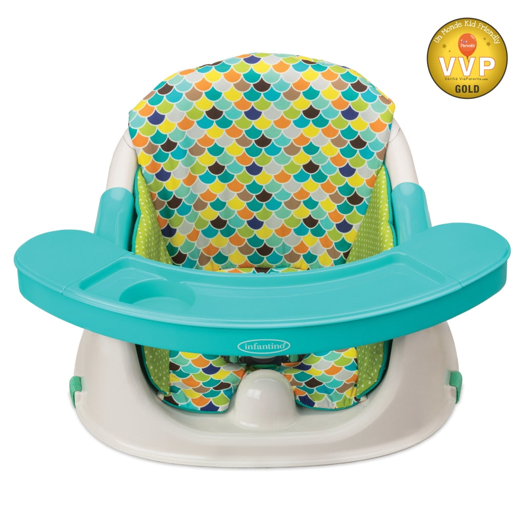 3 en 1, siège d’activités, rehausseur avec plateau pour le repas et rehausseur. La sécurité est maximale avec la ceinture 3 points et la double fixation par sangles pour utilisation sur une chaise d'adulte. L’assise en tissu rembourrée est confortable pour bébé, et amovible pour un entretien facile. Il est muni d'un plateau pour le repas (conforme à la norme alimentaire EU N° 10/2011) avec compartiment pour une tasse ou biberon. Ce plateau est détachable et peut être lavé séparément.