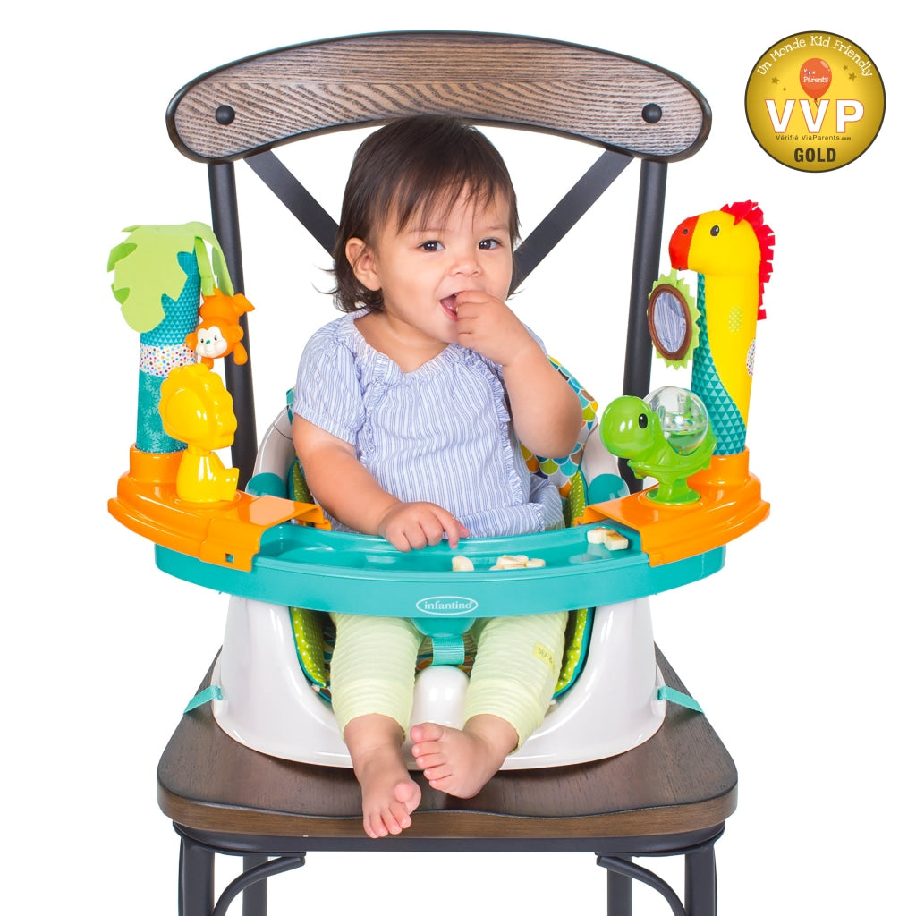 La tablette d’activités est composée de 4 jouets : palmier en tissu qui fait le bruit de papier froissé avec feuillage tout doux en feutrine et petit singe acrobate, le lion couine lorsqu’on appuie sur sa tête, la tortue a une carapace transparente qui tourne avec des billes colorées à l’intérieur, la girafe fait le bruit de papier froissé et est munie d’un joli miroir. La tablette d’activités est coulissante afin de pouvoir positionner les jouets face à bébé ou sur les côtés, ou voir même la détacher pour l’utiliser séparément sur le sol ou sur une table. Facile à transporter grâce à sa poignée située au dos. Idéal pour faire la transition en douceur de la chaise haute à la chaise.