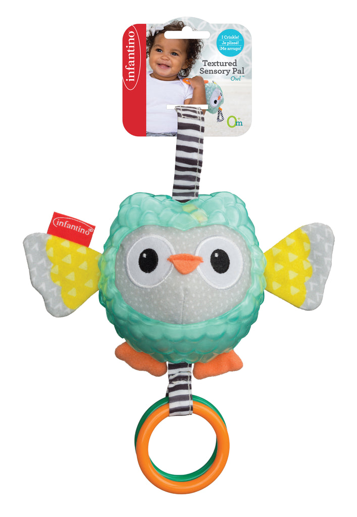 Un hiboux avec plein de surprises. Son corps est en tissu tout doux et ses ailes font un bruit de papier froissé. Facile à attraper par les tout-petits et multi textures pour le développement du toucher. Muni d'un anneau, il peut se suspendre et accompagner bébé n'importe où.
