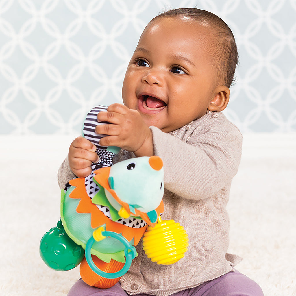 Un hérisson avec plein de surprises. Son corps, en tissu tout doux, fait un bruit de papier froissé et bruits de billes. Il est muni d'un très joli miroir et a quatre pattes en plastique faciles à attraper par les tout-petits et multi textures pour le développement du toucher. Muni d'un anneau, il peut se suspendre et accompagner bébé n'importe où.