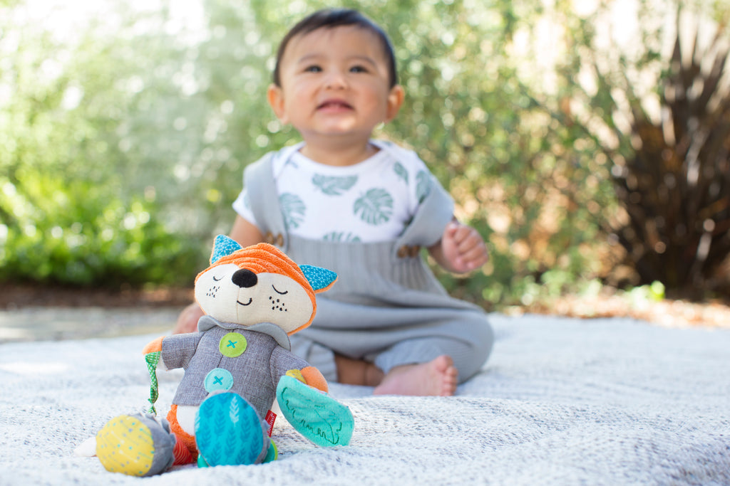 Renard d'activités en tissus très doux, coloré, multi factoriel. Très amusant avec sa petite feuille d'arbre toute douce qui crisse, son anneau de dentition à mordiller, les rubans satinés et surtout le bruit de billes lorsque bébé le secoue ! Il est muni d'un anneau en plastique sur la partie supérieure de sa tête qui permet de le suspendre n'importe où, au siège auto, poussette, portique d'activités, chaise haute.