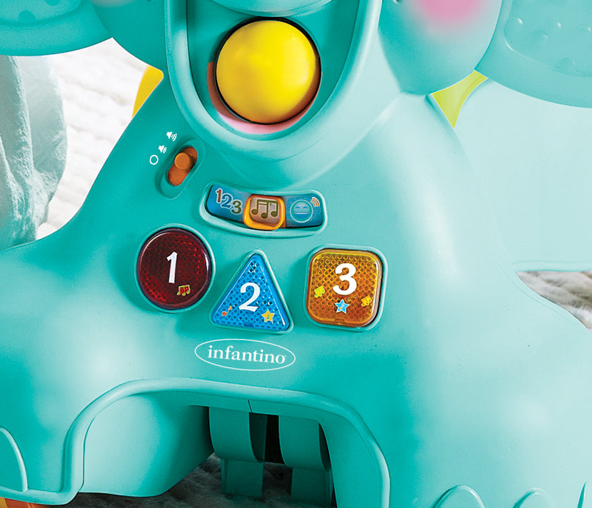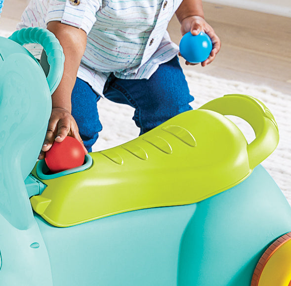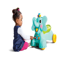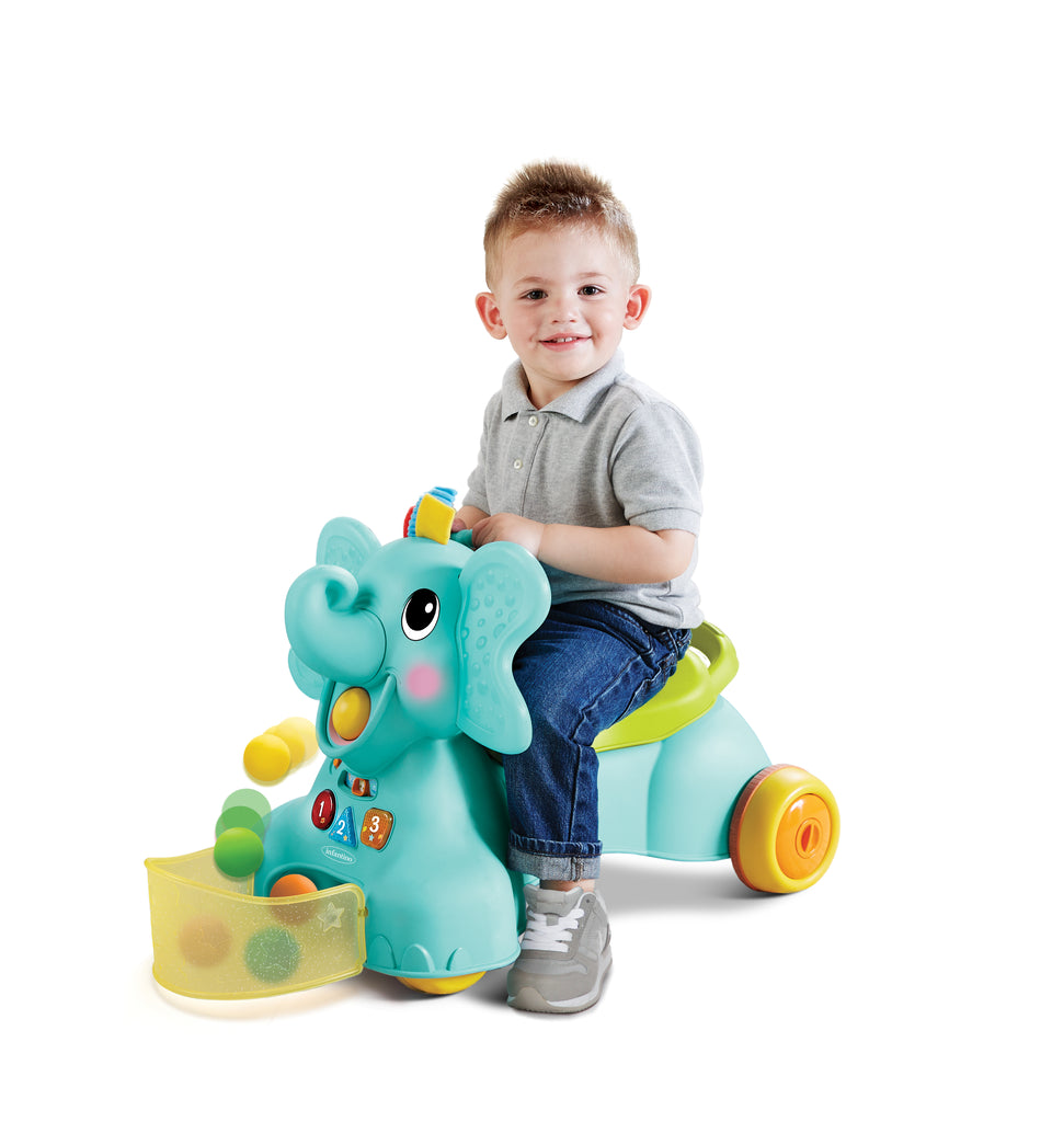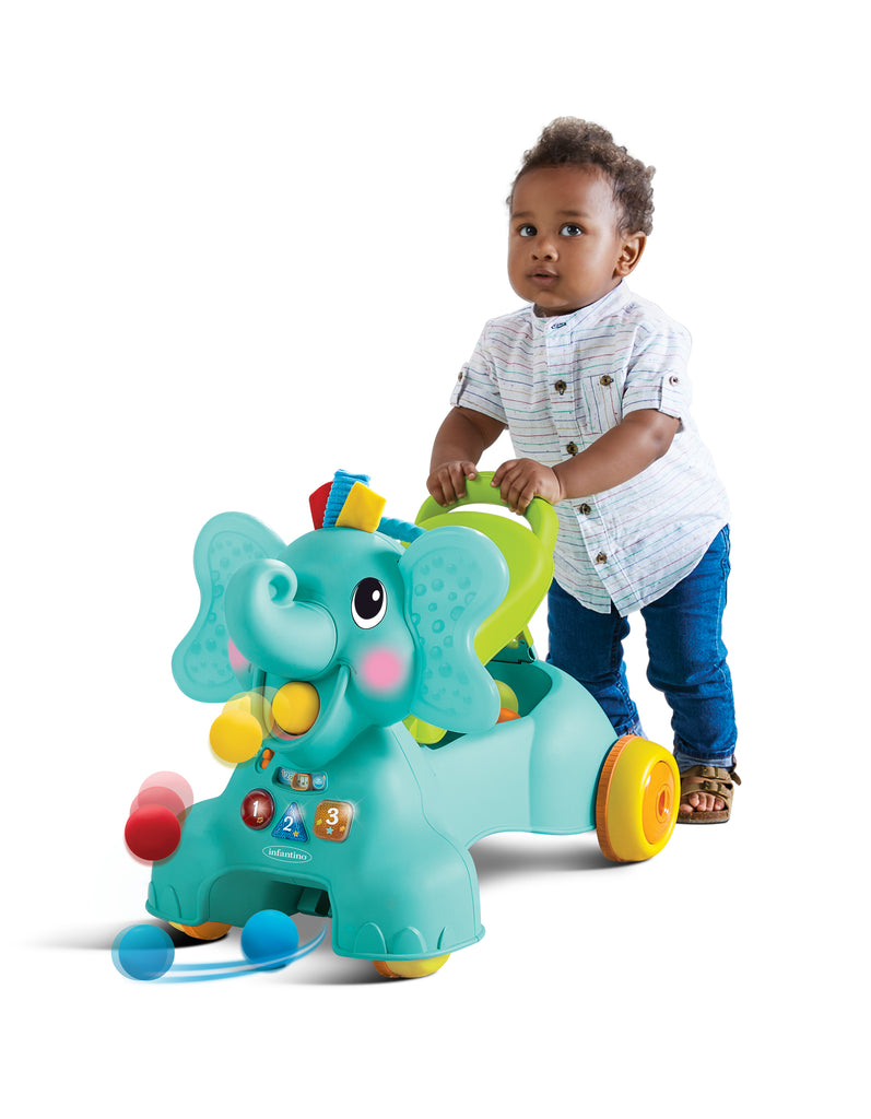 16 mois, mode porteur, bébé est assis sur l'éléphant. Les balles sont éjectées et ramassées pour inciter bébé à avancer tout seul