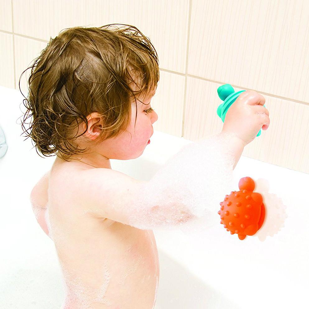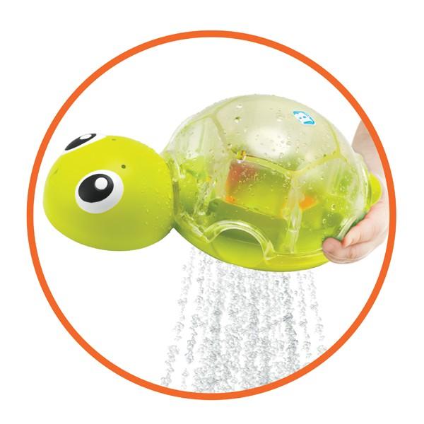 Jeu de bain tortue à fixer, grâce aux 4 ventouses situées sur chacune de ses pattes. La carapace de la tortue est transparente pour pouvoir découvrir les perles colorées s'entrechoquer. La tête de la tortue est un verseur. Son corps est une douchette. Ses pattes souples sont détachables et se transforment en 4 adorables aspergeurs de bain multi textures.