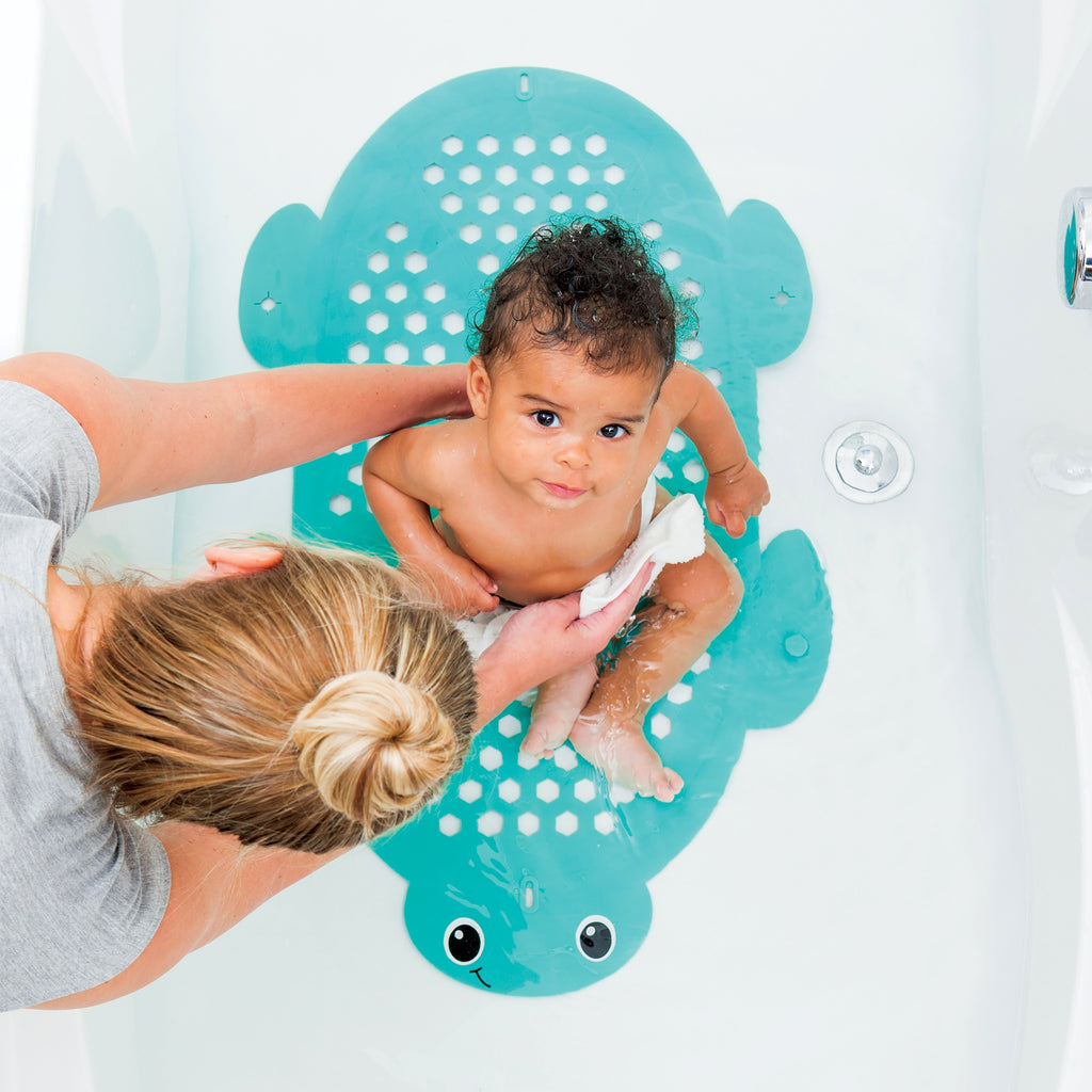 Tapis doux et confortable qui adhère parfaitement à la baignoire. Il se fixe sur le côté de la baignoire grâce à sa large ventouse et son crochet, et se transforme en rangement pour les jouets. Cela permet aux jouets de bain de s'égoutter et de sécher.