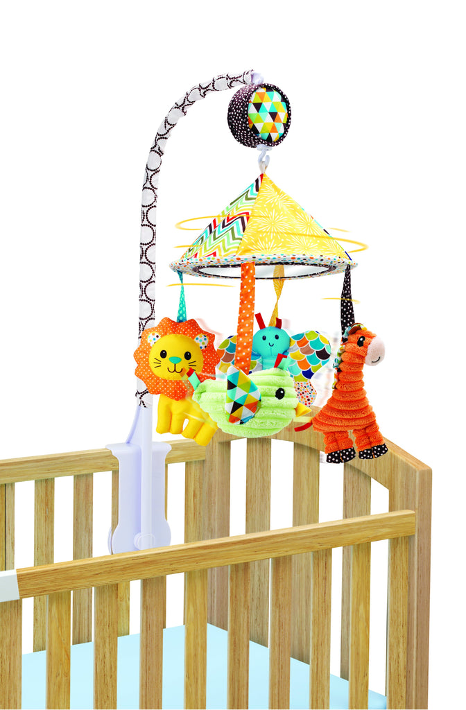Ce très joli mobile musical permet d'apaiser bébé avant qu'il s'endorme grâce à sa musique douce (de 3 minutes). Bébé s'émerveillera du large miroir (de diamètre 14 cm) et des 4 adorables personnages tout doux (lion, papillon, girafe et oiseau) qui tournent lentement. La boîte à musique avec mécanisme à remonter (sans pile), recouverte d'un tissu coloré, est détachable pour être emportée facilement n'importe-où. Pince facile à installer au lit de bébé.